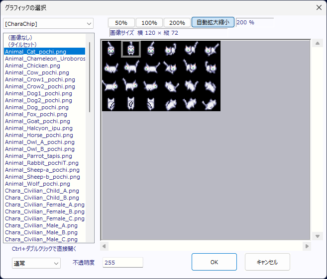 ▲トップへ戻る▲ ■グラフィック ![]() ダブルクリックを実行する事で、「グラフィックの選択」の画面が表示されます。 ![]() 画面左側で画像ファイルを選択し、画面右側でどの画像を使用するのか(どの向きで表示するのか)を選択します。 別のフォルダーにある画像を使う場合は、画面左上の[CharaChip]をクリックして別のフォルダーを選択してください。 必要でしたら画面左下のオプションを設定してください。