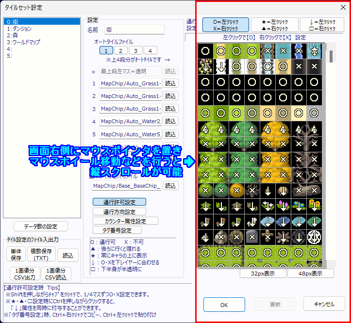 | WOLF RPGエディター(ウディタ)/初心者【サイトトップへ戻る】 ■タイルセット設定 (更新:2025/05/24) 「タイルセット設定」について解説します。 ![]()