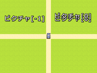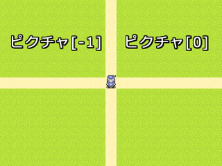 [トランジション準備(画面停止)]と同様にゲーム画面を保存したものを表示する仕様になっていますが、 [ピクチャ[↑0]以外停止]の場合は、停止中でもピクチャ[0以上]の表示が更新されます。 但しピクチャ[0以上]の表示は、停止した瞬間に保存したピクチャ[0以上]の表示の上に、 現在のピクチャ[0以上]の表示が重なって表示されます。 下図は「スクロールとリンク」にチェックを入れて表示した時のピクチャ画像です。