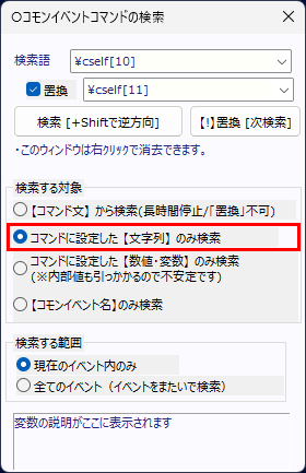 ボタンは検索[+Shiftで逆方向]と【!】置換 [次検索]があります。 「検索語=1600010」「置換=1600011」の時に検索[+Shiftで逆方向]か【!】置換 [次検索]を押すと、 セルフ変数[10]が設定されている所にカーソルが移動します。 セルフ変数[10]が設定されている所で【!】置換 [次検索]を押すとセルフ変数[10]がセルフ変数[11]に置き換わり、 次にセルフ変数[10]が設定されている所にカーソルが移動します。 この設定は置き換えたくないと言った場合は検索[+Shiftで逆方向]を押すと置き換えは実行されずに、 次にセルフ変数[10]が設定されている所にカーソルが移動します。