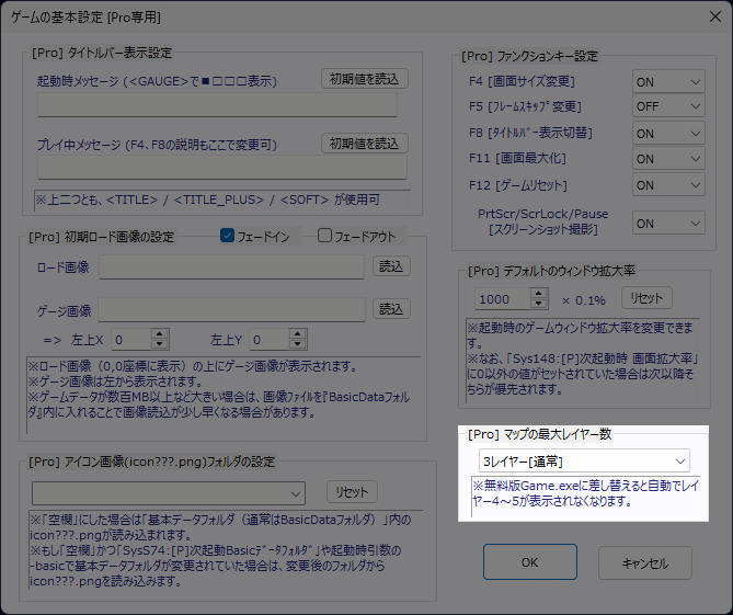 ![]() ▲トップへ戻る▲ ■[Sys157:[読]横方向の字詰めピクセル[px] ※ゲーム基本設定] ■[Sys158:[読]改行の間隔[px] ※ゲーム基本設定] ■[Sys159:[読]選択肢の改行間隔 ※ゲーム基本設定] ゲームの基本設定にある「文章表示(文字列ピクチャ)微調整」の設定内容を取得します。 ![]() ▲トップへ戻る▲ ■[Sys160:[読]最大マップレイヤー数] ゲームの基本設定[Pro専用]の「マップの最大レイヤー数」で設定したレイヤー数を取得します。 無料版のウディタでは「3」を取得します。 ▼「マップの最大レイヤー数」の設定画面 ![]() ▲トップへ戻る▲ ◎関連ページ ◆「変数」って何? ┣◆「セルフ変数」って何? ┣◆「通常変数」「予備変数」って何? ┣◆「文字列変数」って何? ┣◆「システム変数」「システム文字列」って何? ┃┣◆システム変数[0〜34]の説明 ┃┣◆システム変数[35〜76]の説明 ┃┣◆システム変数[77〜120]の説明 ┃┣◆システム変数[121〜160]の説明 ┃┣◆システム文字列[0〜49]の説明 ┃┗◆システム文字列[50〜80]の説明 ┣◆「変数呼び出し値」「X番の変数呼出」って何? ┃┗◆【使用例】「変数呼び出し値」「X番の変数呼出」 ┣◆「乱数」って何? ┃┗◆乱数で一度出力した値を二重に出力させない ┗◆変数の番号や文字列を別のものに置き換える |