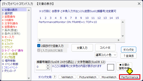 ▲トップへ戻る▲ ■[SysS 79:[読]ゲーム名 メイン] ■[SysS 80:[読]ゲーム名 追記] ゲームの基本設定で設定したゲーム名の「メイン」と「追記」の文字列を取得します。 ![]() ▲トップへ戻る▲ ■[SysS 82:[読]パフォーマンスモニター最終出力文] 【文章の表示】の[Performance]を使用した時に、最後に出力した処理結果を取得します。 【文章の表示の[Performance]の説明を見る】 ![]() ▲トップへ戻る▲ ■システム文字列を文章に表示する特殊文字について システム文字列の内容を文章として表示する場合は、特殊文字「\sysS[〜変数番号〜]」を設定します。 ▼設定例(システム文字列[1]をデバッグ表示する時)