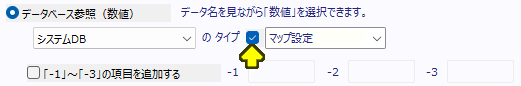 ▲トップへ戻る▲ ■特殊設定:データベース参照(数値) 指定したデータベースのデータ名の一覧を表示する設定を行います。 ![]() なお、以下のチェックボックスにチェックを入れると、タイプの名前を選択して設定する事ができます。 ![]()
