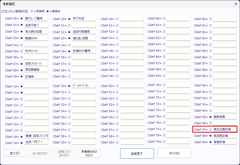 ▼負けた時 ![]() ▲トップへ戻る▲ ■戦闘前に演奏していたBGMを戦闘終了後に続きから演奏させる 戦闘開始前に演奏していたBGMを戦闘終了後に再演奏させる際、初期設定ではBGMの最初からの演奏になりますが、 これを戦闘開始直前に演奏されていた位置から演奏するように改造します。 改造設定はコモンイベント[188:X◆戦闘処理]にて行います。 コモンイベント[188:X◆戦闘処理]の「セルフ変数使用状況」にて、セルフ変数[97:再生位置記憶]を設定してください。 ![]() 14行目に以下のイベントを追加してください。