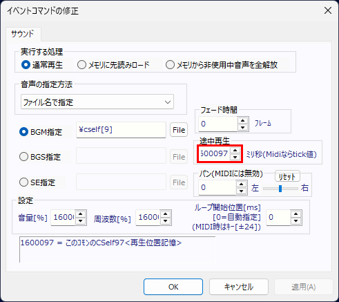 239行目と243行目にあるイベントコマンド【サウンド】を開き、それぞれの途中再生に「1600097」を設定してください。 ![]() 以上で設定完了です。 ▲トップへ戻る▲ ■戦闘終了後に戦闘不能から回復させない サンプルゲームの初期設定では、戦闘時に戦闘不能になっても戦闘終了後にHP「1」で回復する設定になっています。 もしも戦闘終了後にHP「1」に回復せず、戦闘不能のままにしたい時には、 ユーザーDB[17:システム設定]の項目[21:移動時の戦闘不能の扱い]の設定を「0:戦闘不能のまま」に変えてください。 ![]() ▲トップへ戻る▲ ◎関連ページ ◆キャラクターイベントを作る ◆エンカウントで敵を出現 ◆[戦闘改造]全ての敵キャラを強くする |