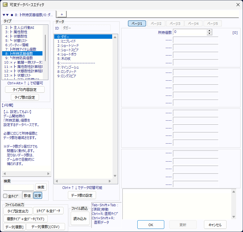 | WOLF RPGエディター(ウディタ)[3.663]/基本システム【サイトトップへ戻る】 ■コモンイベント[001:○武器増減]の解説 (更新:2025/11/15) コモンイベント[001:○武器増減]について解説します。