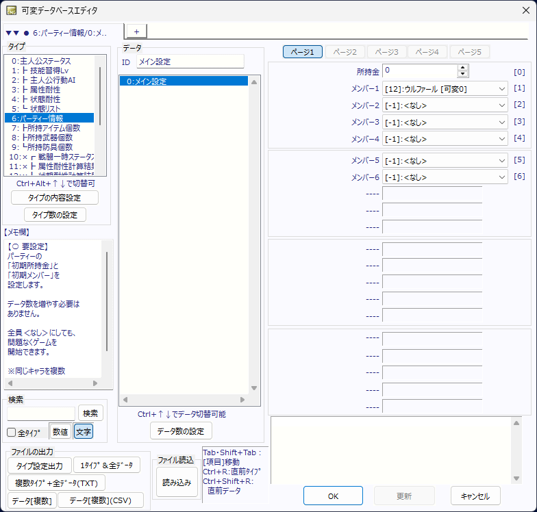 基本システムに関する説明は別ページに記載しています。 コモンイベントの一覧と補足説明のページも用意しています。 ■コモンイベント[003:○お金の増減]って何? イベントコマンド【イベントの挿入】を使ってコモンイベント[003:○お金の増減]を呼び出す事で、 所持金を増減する事ができます。 ▼イベントコマンドの設定画面 ![]() 所持金は、可変DB[6:パーティー情報]の項目[0:所持金]に保存されます。 ![]() 一応この可変DB[6:パーティー情報]の項目[0:所持金]の数値を変えても所持金を変える事ができますが、 このコモンイベント[003:○お金の増減]を呼び出して所持金を変える方法だと、 以下のようなメッセージを表示する事ができます。 ![]() 現在の所持金を調べる場合は、コモンイベント[020:▲所持金取得]を呼び出して調べてください。 お金の単位はユーザーDB[15:用語設定]の項目[18:[ステータス]お金の単位]で設定できます。 ▲トップへ戻る▲ ■[入力の数/結果を返す]について