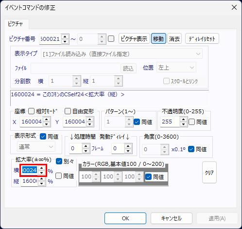 ■条件分岐(変数): 【1】 CSelf23[拡大率(横)] が 0 と同じ |