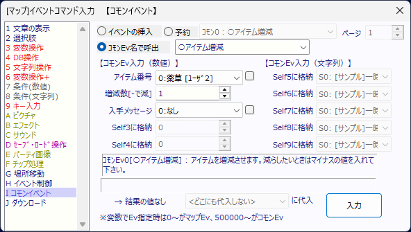 ▼コモンイベントのバグ修正に関して ウディタがバージョンアップする際、コモンイベントのバグが修正される事があります。 ▼ウディタ[2.22]の更新時にバグが修正された一例 ![]() 古いコモン素材では、バグを修正する前の古いコモンイベントを使っている事があるため、 古いコモン素材にあるコモンイベントを読み込む事で、修正されていたバグが再発する事があります。 このような場合は、修正されたコモンイベントにある修正用のイベントコマンドをコピーし、 コモン素材にあるコモンイベントに貼り付けて修正するような作業を、コモン素材利用者自らが行う必要があります。 ▲トップへ戻る▲ ■補足 基本システムでは、システムDB[14〜23]の通常変数や予備変数、 システムDB[4:文字列変数名]の文字列変数は使用していません。 コモンイベント同士の変数のやり取りは「入力の数 / 結果を返す」を使ったり、可変DBを使ったりしています。 基本システムでは、ピクチャ番号「10000〜19999」を使っています。 そのため、メニュ画面や戦闘画面を表示している時に何らかのピクチャを表示する場合は、 ピクチャ番号「10000〜19999」以外を使ってピクチャを表示してください。 【基本システムで使用しているピクチャ番号の紹介ページを見る】 ウディタ[2.20]で新しいゲーム画面のサイズが加わるなどの仕様の変更があった関係で、 いくつかのコモンイベントにはバージョン[2.20]以降の対応した設定と[2.20]以前に対応した設定があり、 同じような設定が二重に設定されている事があります。 コモンイベントの処理では、ユーザーDBや可変DBの項目名を指定してイベントを処理している事があります。 そのため、ユーザーDBや可変DBの項目名を変えるとエラーが発生する可能性があります。 ▼項目名は初期設定のままにしてください ![]() 新たな項目を追加する時には、ユーザーDB[0:技能]なら項目名37以降、 可変DB[0:主人公ステータス]なら項目名59以降と言ったように、後ろに追加する形で項目を追加してください。 またデータベース内に「この項目は使わない」と思った項目があったとしても、削除せずにそのままにしてください。 ▲トップへ戻る▲ ◎関連ページ ◆「基本システム」って何? ┣◆コモンイベントの一覧と補足説明 ┣◆基本システムで使用しているピクチャ番号 ┣◆メニュー画面の処理構造 ┗◆戦闘処理の処理構造 ◆エンカウントで敵を出現 ◆万能ウィンドウについて ┗◆万能ウィンドウの設定例 ◆[戦闘画面]敵キャラの表示設定について ┗◆[戦闘改造]敵キャラの表示位置を移動&主人公画面の後ろに表示 |