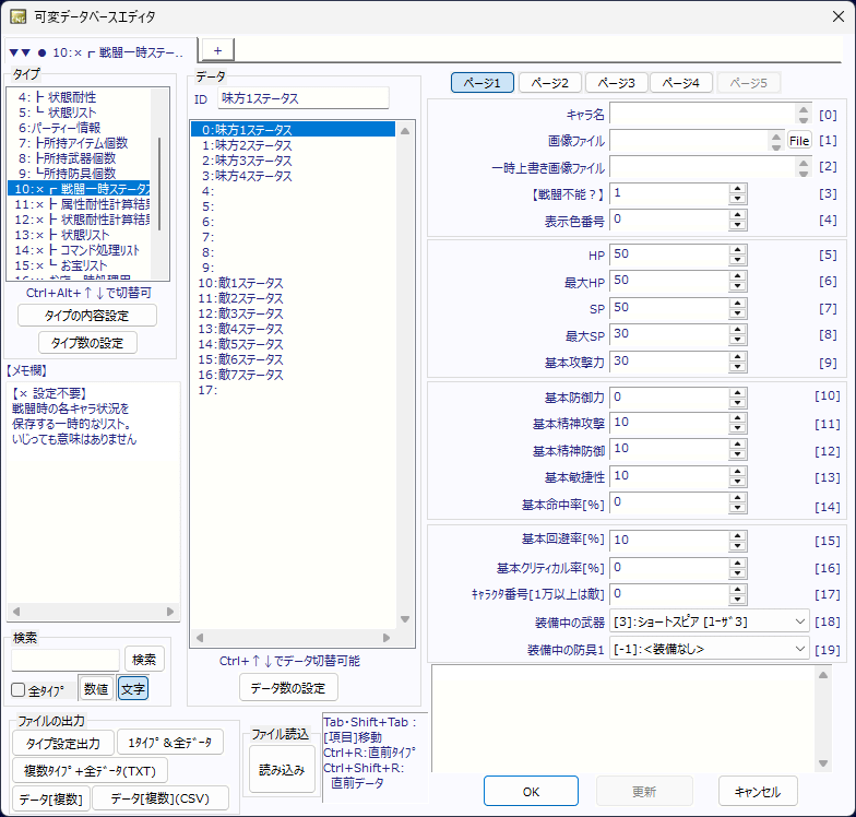当ページには万能ウィンドウに関する説明が無いため、万能ウィンドウに関しては、以下のページをご覧ください。 ▲トップへ戻る▲ ■可変DBや変数について 戦闘の処理では、戦闘用の可変DBを使って現在のHPや攻撃力などを保存します。 そのため、戦闘中に主人公の攻撃力が2倍になっても、マップ移動時の攻撃力(可変DB[0:主人公ステータス])には変化が無く、 戦闘終了後に元の攻撃力に戻すような処理は必要ありません。 戦闘中に使用される可変DBは以下のとおりです。