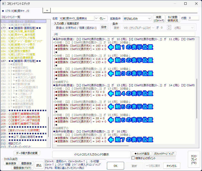 ![]() 表示位置を補正したい敵キャラの設定を行ってください。 ![]() コモンイベント[175:X[戦]敵キャラ_座標算出]の64行目に以下の設定を追加してください。