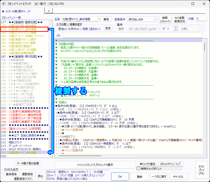 | WOLF RPGエディター(ウディタ)[3.677]/戦闘改造【サイトトップへ戻る】 ■敵キャラの表示位置を移動&主人公画面の後ろに表示 (更新:2026/02/07) 敵キャラの表示位置の補正、敵キャラのHPの表示有無の設定、 主人公のステータス画面の下に敵キャラが表示されるように設定などを行います。 なお、敵キャラの表示設定に関する説明は、別ページに記載しています。 ■改造内容の確認 敵キャラの表示は、初期設定では以下のように表示されます。 ![]() 今回の改造では、下図のように敵キャラの表示位置を下げたり、敵キャラのHP表示を消去したりします。 ▼表示位置を下げているので、上図と比べてドラゴンの羽が全て見えている ![]() 今回の改造で敵キャラの画像を下げる事で、主人公のステータス画面の上に敵キャラの画像が重なってしまう事があります。 ![]() 当ページにある■主人公のステータス画面のピクチャ番号を変えるでイベント設定を変更すると、 主人公のステータス画面の下に敵キャラが表示されるようになります。 ▲トップへ戻る▲ ■コモンイベントの複製と補足 コモンイベントの改造を行う場合は、複製したコモンイベントで改装した方が良いでしょう。 ![]() コモンイベントの仕様では、同じ名前のコモンイベントが複数ある場合は、コモンイベントIDを大きい方が実行されます。 上図の場合は、コモンID[179]とコモンID[215]に同じ名前のコモンイベントがあるので、 この場合はコモンID[215]の方が実行され、コモンID[179]は実行されません。 コモンID[215]の方のコモンイベント名を一時的に「X[戦]敵キャラ_単体描画あ」などと違う名前にすると、 コモンID[179]の方が実行されるようになり、改造前の状態で動作テストする事ができます。 もしも改造に失敗した場合は、改造したコモンID[215]の方を削除すれば、すぐに改造前の状態に戻せます。 ※改造前の状態に戻す場合は、ユーザーDBに追加した項目も削除してください。 以下は補足説明です。